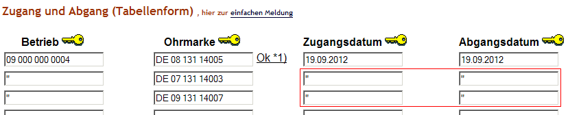 Zur schnelleren Erfassung ist die Eingabe des doppelten Hochkomma " als Gänsefüßchen möglich. Dadurch werden die Angaben aus dem darüber liegenden Feld übernommen - sinnvoll bei vielen Zu- und Abgängen zum selben Datum oder wenn das Mutterunternehmen angemeldet ist und für verschiedene Betriebsstätten die Zu- und Abgänge eingibt oder ein Vollmachtnehmer für seine Betriebe (Vollmachtgeber) die Meldungen erfasst .